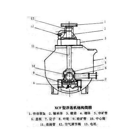 XCF型充氣式浮選機結構如圖所示,由容納礦漿的槽體、帶上下葉片的大隔離盤葉輪、徑向葉片的座式定子、對開式圓盤式蓋板、對開式中心筒、帶有排氣孔的連接管、軸承體以及空心主軸和空氣調節閥組成。深槽型槽體,有開式和封閉式兩種結構。軸承體有座式和側掛式,安裝在兼作給氣管的橫梁上。