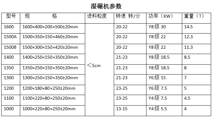 各大小系列濕碾機在傳統機器的基礎上改制而成,傳統機器由于工件大且使用周期短、電機動力大,安裝周期長,用戶不能馬上投入生產,維護更換材料時需要大型吊裝設備等問題。本公司經過幾十年實踐根據用戶反饋的信息,在長沙礦山機械設計研究院專家的指導幫助下,從解決應急現實問題出發。鑄件加配合金元素使用壽命大大提高,產量能提高30%-60%,由于鑄件采用小件對接安裝,不受場地影響,降低了生產成本。配備電機小于傳統濕碾機電機的30%且廠家可配備軟啟動設備,機架設計為:方鋼焊接,槽鋼連接,正常使用中不再因機器問題而耽誤生產。