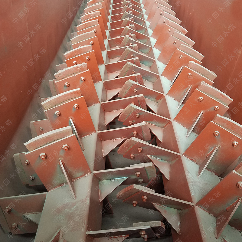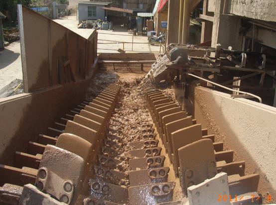礦漿由槽的下端給入,泥團的膠結體被葉片切割、擦洗并借斜槽上端給入的高壓水沖洗,將粘土和礦塊分離,洗下的粘土物資從下端的溢流槽排出。粗粒物料則借葉片推動,從槽上端的排礦口排出,洗礦時間由槽的長度、螺距和軸的轉速共同決定。